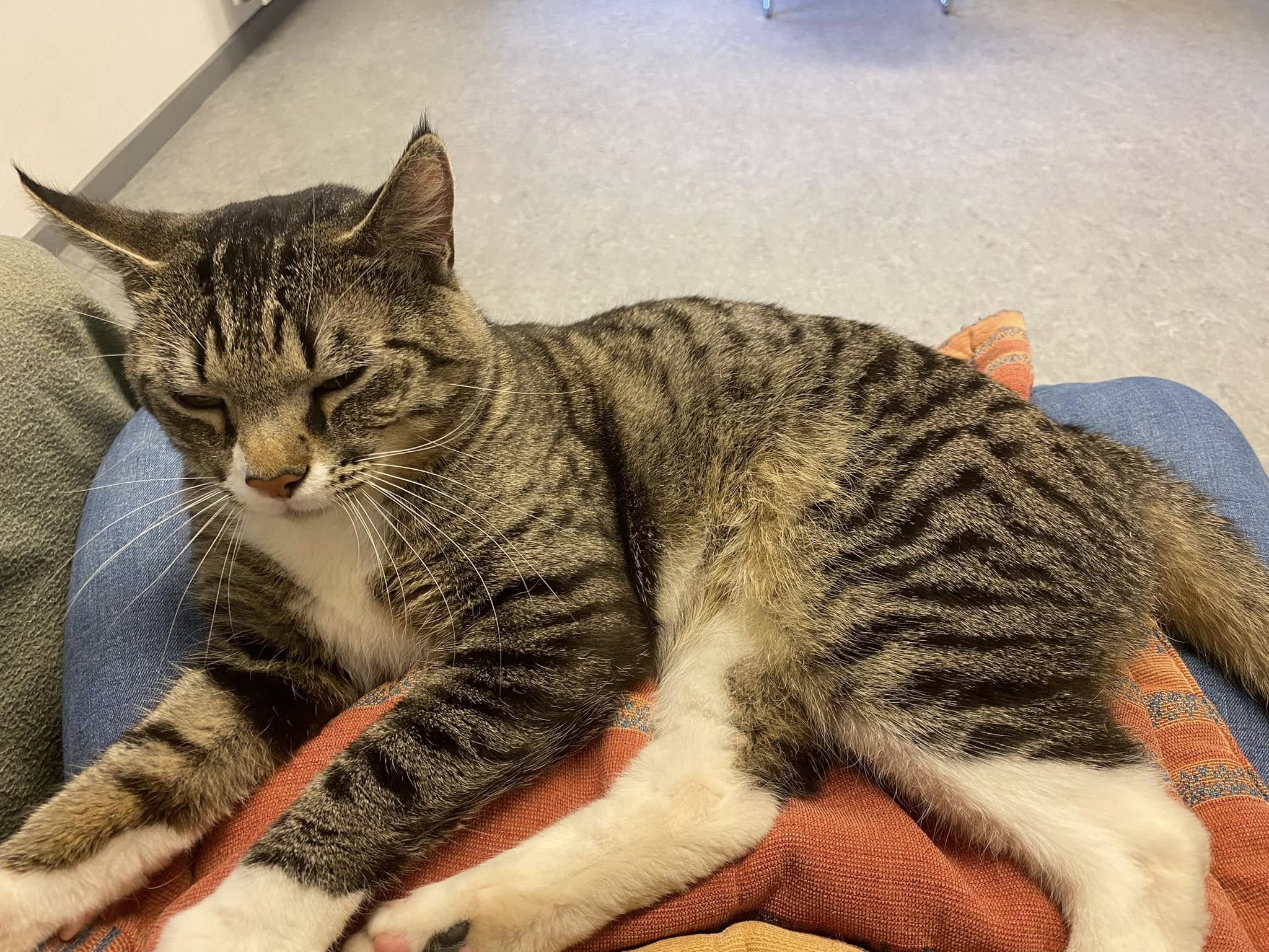 Juno er en stor flot hankat der passer meget sig selv for det meste, men han vil gerne have selskab af sin ejer, og kan godt ligge i sofaen og hygge.
